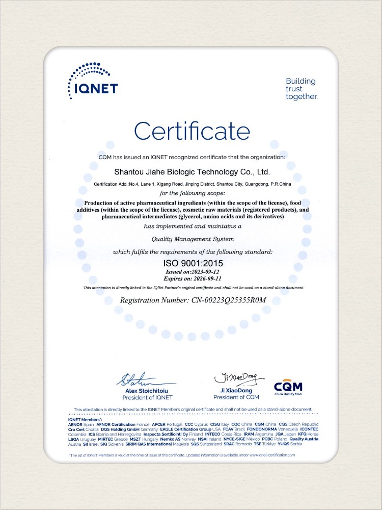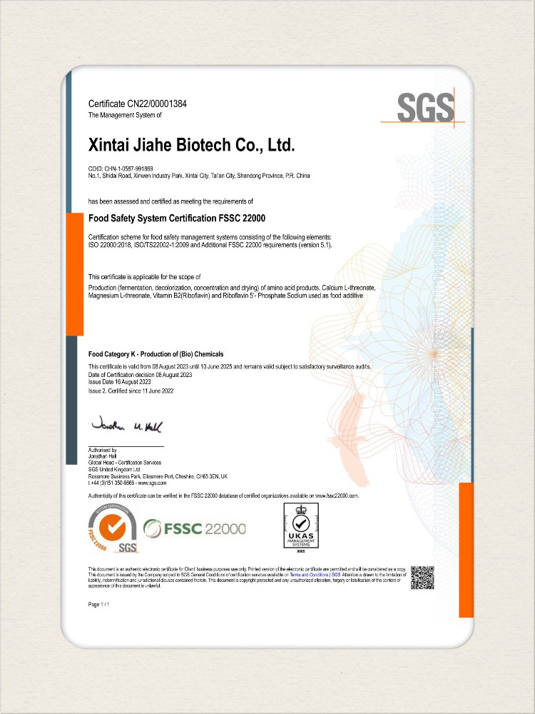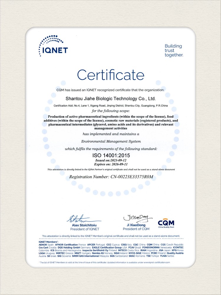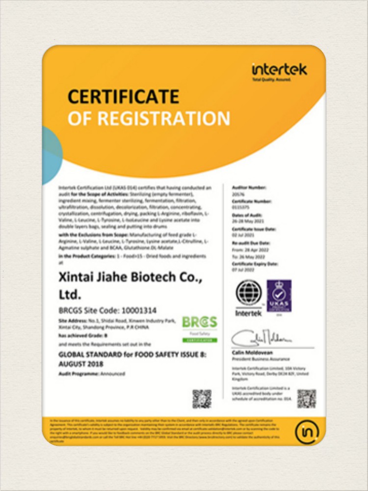 汕頭佳禾生物科技有限公司是一家致力于氨基酸及其衍生物研發(fā)、生產(chǎn)和銷售的國家高新技術(shù)企業(yè),先后通過了國家藥品GMP認(rèn)證,ISO9001質(zhì)量體系認(rèn)證、ISO14001環(huán)境管理體系認(rèn)證。目前,公司擁有“廣東省專精特新中小企業(yè)”、“廣東省氨基酸產(chǎn)品工程技術(shù)研究中心”、“汕頭市生物發(fā)酵工程技術(shù)研究開發(fā)中心”、“汕頭市知識產(chǎn)權(quán)優(yōu)勢企業(yè)”、“多項國家發(fā)明專利”、“廣東省守合同重信用企業(yè)”等多項資質(zhì)和榮譽(yù),旗下“佳禾牌”系列產(chǎn)品已成為原料藥行業(yè)知名品牌。 新泰市佳禾生物科技有限公司成立于2012年8月,注冊資金2億元,公司位于山東泰安新泰市新汶工業(yè)園區(qū),是國 家級高新技術(shù)企業(yè)、山東省“專精特新”企業(yè)、山東省制造業(yè)單項冠軍企業(yè)、泰安市科技型中小企業(yè)、泰安市農(nóng)業(yè)產(chǎn)業(yè)化龍頭企業(yè)、中國生物發(fā)酵產(chǎn)業(yè)協(xié)會理事單位。